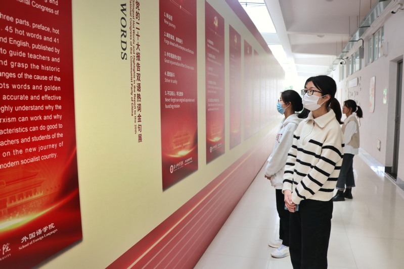 展览由前言、热词和金句三部分组成,选取了《中国日报双语新闻》刊发的“新征程”“全过程人民民主”等45个热词、“江山就是人民,人民就是江山。中国共产党领导人民打江山、守江山,守的是人民的心。”等41条金句,采用中文、英文双语的形式,以双语热词和金句这个最为精准有效的切入点,引导师生了解掌握党和国家事业取得历史性成就、发生历史性变革,深刻认识中国共产党为什么能、马克思主义为什么行、中国特色社会主义为什么好,激励师生以昂扬姿态,满怀信心投身全面建设社会主义现代化国家新征程。