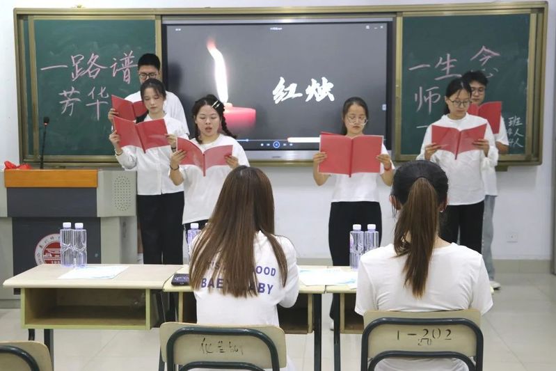 本次团日活动形式多样,内容丰富,内涵深刻。22级商务英语1班首先朗诵了《致敬,亲爱的老师》,让同学们感悟到了老师们的用心良苦,并观看了献礼短片《何以为师》,懂得了尊师重道的重要性。22级商务英语2班进行了“桃李竞芳菲 ,礼赞教师节”的朗诵,表达了对老师们真挚的感谢。22级英语(师范类)4班进行了合唱《听我说谢谢你》,表达了对老师的赞美。