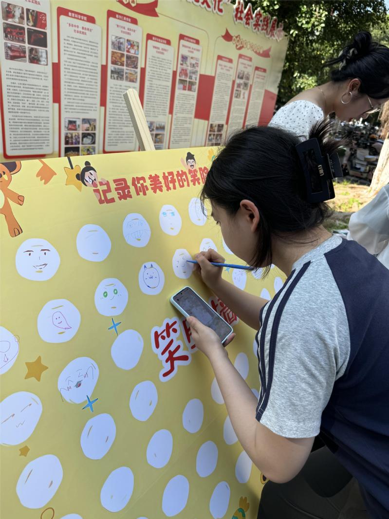 在“共绘笑脸墙”环节,同学们手持画笔与颜料,依次在展示架上描绘心中的笑脸。大家你一笔我一划,有的勾勒弯弯的眼睛,有的涂抹灿烂的嘴角,色彩在展示架上交融,一张张各具特色的笑脸逐渐呈现。有同学表示,“每一笔都承载着大家对生活的热爱,看到这么多笑脸汇聚在一起,内心特别温暖”。