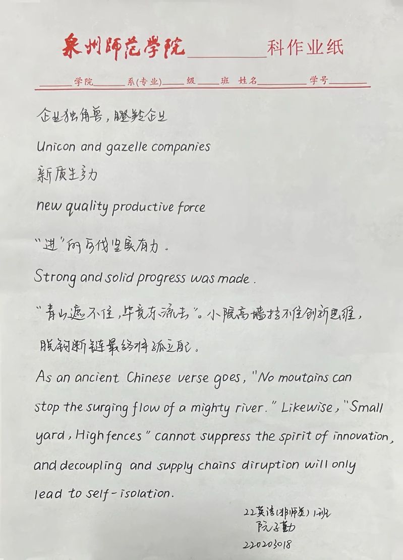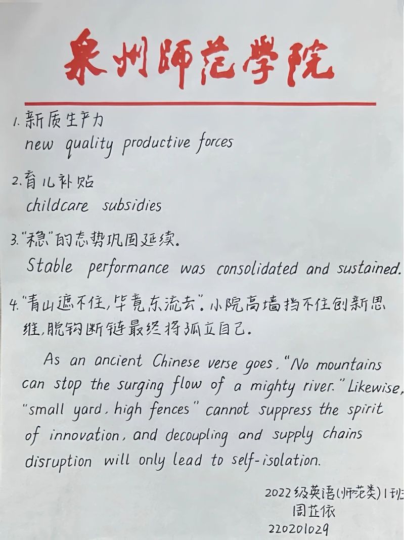 2025年4月以来,外国语学院举办了学习2025年全国两会双语热词金句摘抄大赛。