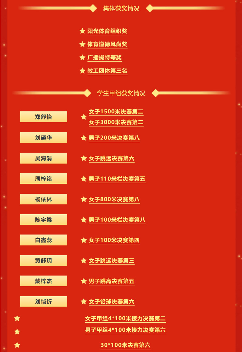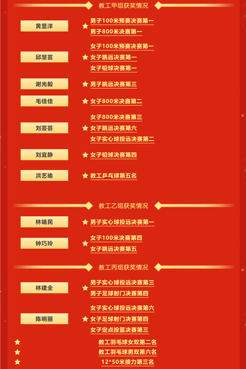 收官日,文传师生再创佳绩。教工组黄显洋老师勇夺男子800米第一名;毛佳佳、刘芸芸老师在女子800米决赛分获亚、第三名。学生组在女子实心球投远项目表现出色,苏琳靖同学夺冠,林子慧同学获第三名;赖秋婷同学在女子三级跳远项目获第三名。