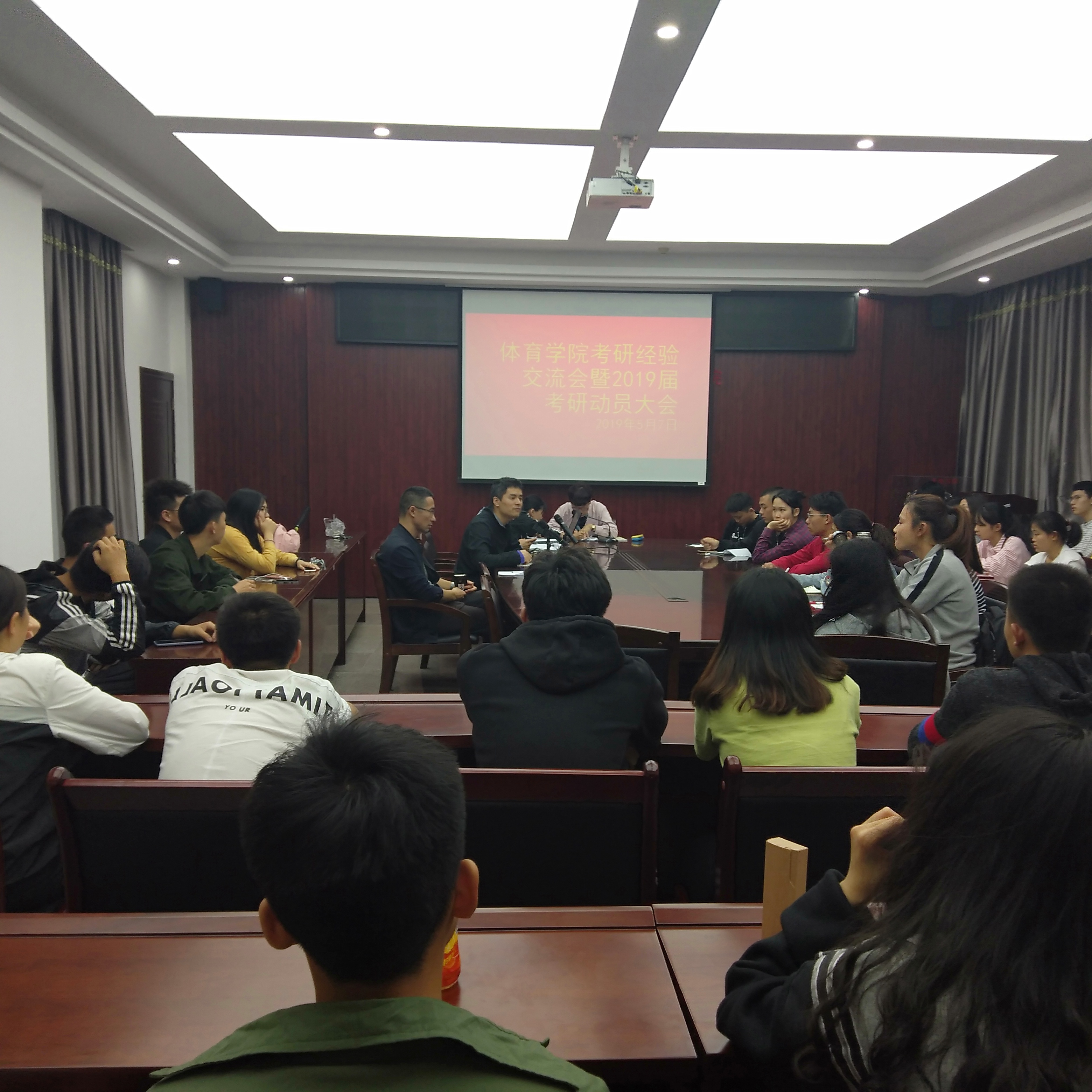 2019年5月7日晚上七点,我院在陈伟利体育馆二楼会议室,举行2019年考研经验交流会暨考研动员大会。体育学院许月云院长、马文友博士、任慧涛博士、王延婷老师以及15级考研录取的学生代表特邀嘉宾,体育学院16、17、18级有考研意向的同学参加了本次会议。