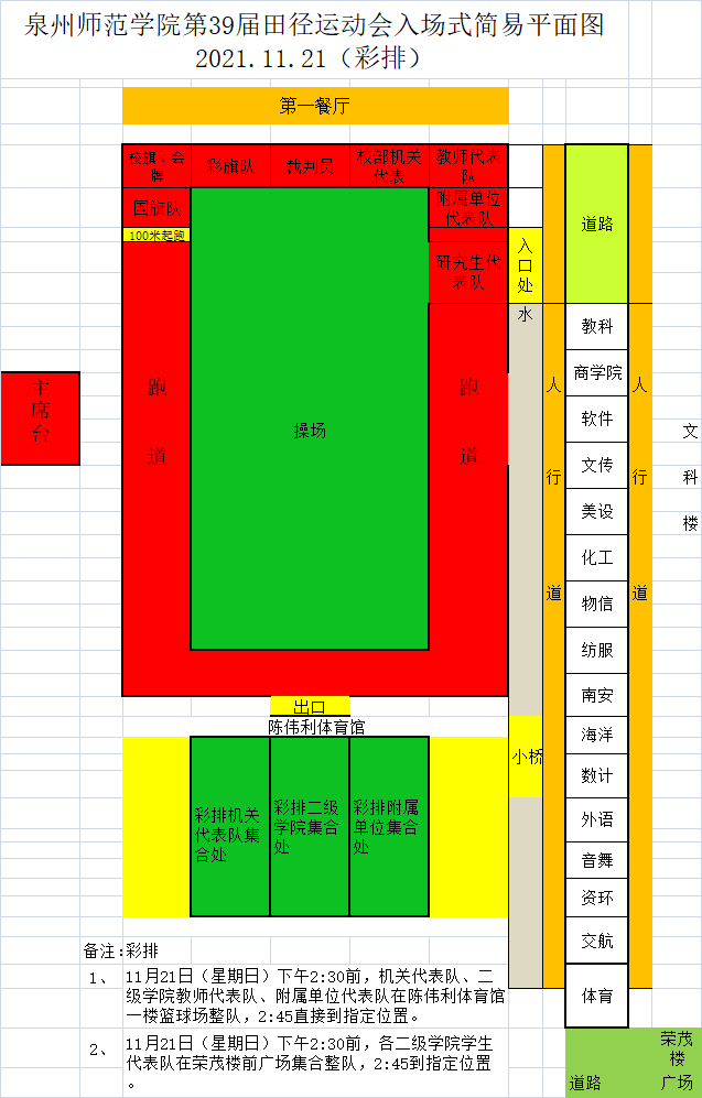 1121日(星期日)下午300在田径场举行入场式、广播操及广场表演节目预演。
