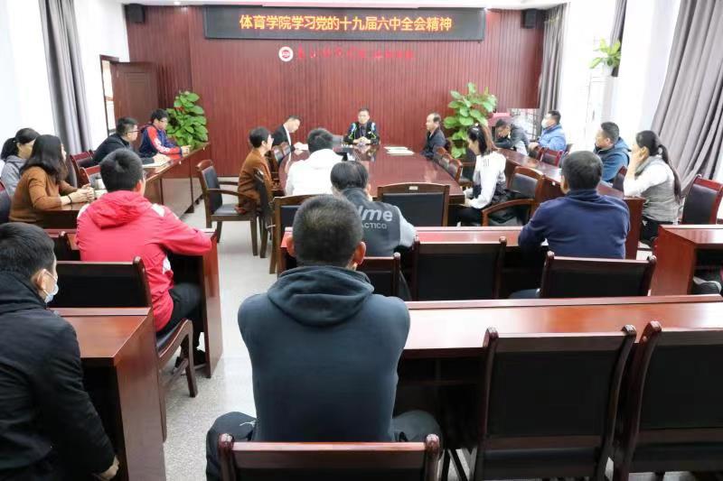 1122午,伟利体育馆二楼会议室召开体育学院党委理论学习中心组学习会议,深入学习贯彻党的十九届六中全会精神,会议由学院党委书记卢进民主持,院领导、各党支部书记参加129日,在伟利体育馆二楼会议室召开全体党员会议,深入传达学习党的十九届六中全会精神。