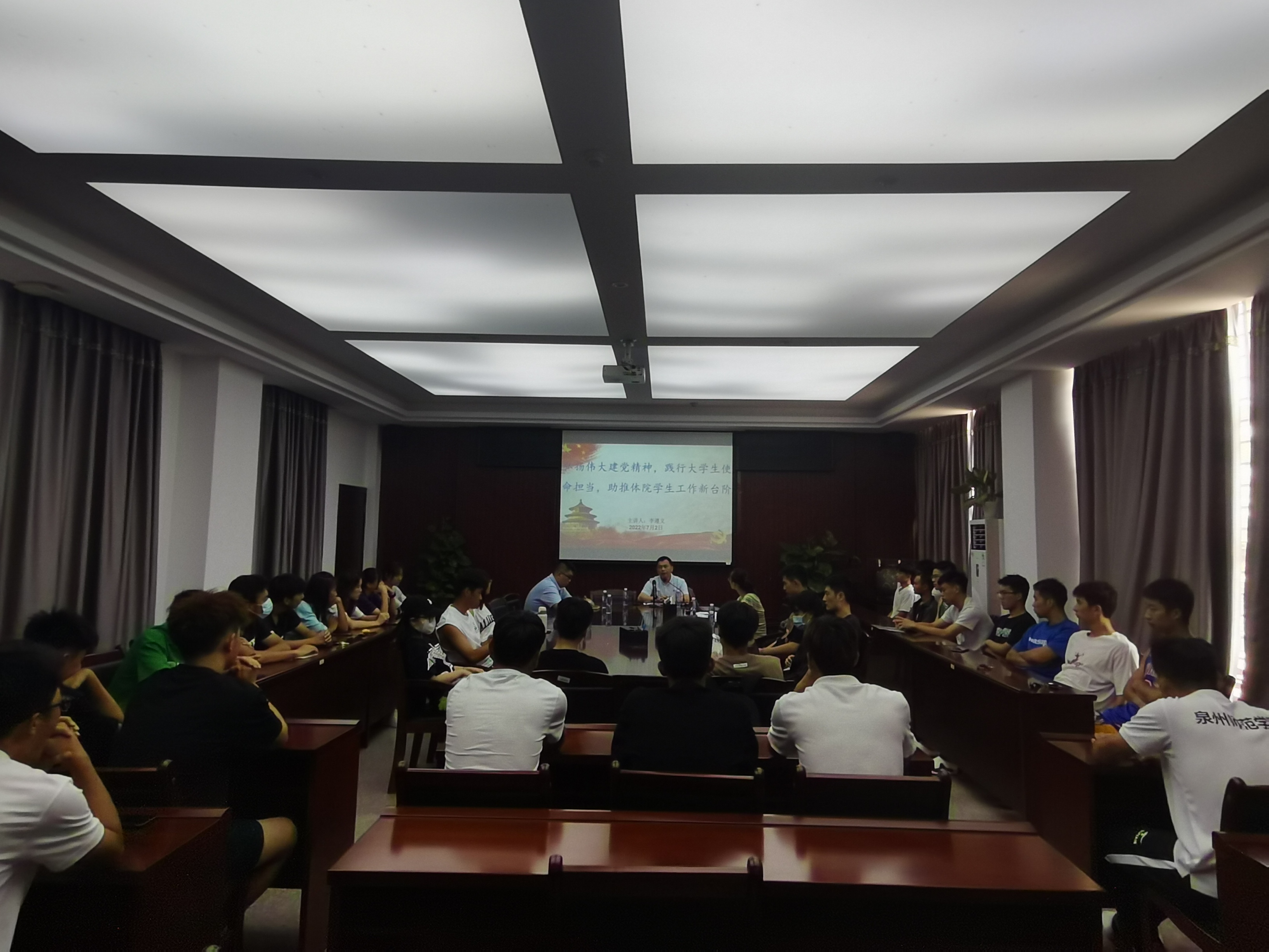 李遵义从三个方面与同学们进行了交流,一是解读了伟大建党精神的丰富内涵和精神实质,介绍了中国共产党在各个历史时期所形成的精神谱系及其与伟大建党精神的关系。教育大家深刻理解伟大建党精神的时代价值,牢固树立共产主义的远大理想和马克思主义的信仰;二是结合伟大抗疫精神和体育人拼搏奋斗精神主题,鼓励大家全力以赴参加省大学生运动会各项比赛,立志为学校争光。启发大家深刻理解新时代体育人的使命担当,从而推广科学健身,为健康中国的建设作贡献。三是引导大家深刻理解学校学习和人生理想的关系,勉励同学们牢记初心使命,赓续红色血脉,在实现中华民族伟大复兴的新征程上勇挑重担、勇克难关、勇斗风险,努力做德智体美劳全面发展的社会主义建设者和接班人。广大青年要不断进行思想淬炼、政治历练和实践锻炼,以高昂的行动姿态向正确的行动方向前进,在学习中华民族奋斗史、牺牲史、探索史、建设史后,将青春热血注入笔墨,书写中华民族的造福史。