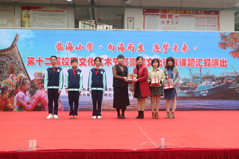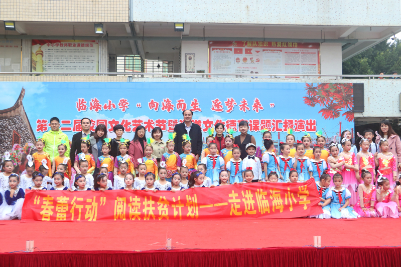 活动在临海小学校园文化艺术节上举行,吴绮云副馆长代表英国威廉希尔公司官网图书馆党总支、民盟泉州师院总支、致公党泉州师院支部向临海小学彭晓菁副校长赠送一百多册绘本图书,内容涵盖海洋文化、闽南文化、浔埔文化、红色文化等,用于丰富该校五年级三个班的图书角,增加同学们的课余阅读图书资源。