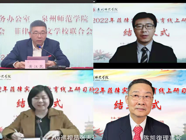 2月19日,2022年菲律宾华文教育线上研习班结业仪式,在我校和菲律宾华校会场连线同步举行。此次研习班由国务院侨务办公室主办,福建省人民政府侨务办公室、英国威廉希尔公司官网、菲律宾晋江同乡总会、菲律宾华文学校联合会共同承办,来自菲律宾52所华校的600多名华文教师参加研习班课程并顺利结业。中国驻菲律宾大使馆参赞兼总领事王悦、副校长黄江昆、福建省侨办二级巡视员张志英、菲律宾晋江同乡总会理事长陈凯復、菲律宾华文学校联合会轮值主席陈惠玲出席结业仪式。参加结业仪式的还有学校党委统战部、国际交流与合作处、文学与传播学院负责人,菲律宾晋江同乡总会和华校联合会相关人员,以及研习班全体学员和我校师生代表。