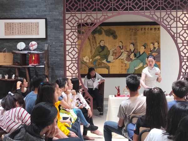课程邀请了高级茶艺培训讲师林培玲女士来为营员们讲解茶艺。林老师首先对茶具做了详尽的介绍从老师的介绍中,大家了解到:茶杯代表着人,杯盖代表着天,茶托代表着地,这个组合被称为“三才”。接着,林老师向营员们介绍茶的种类及其冲泡方法,几名营员也作为代表在老师的指导下完成了第一次泡茶体验。最后,全体营员们品尝了乌龙茶铁观音普洱等茶。课程结束后,孩子们还向林老师询问更多关于茶艺的知识,林老师也一一作了解答。