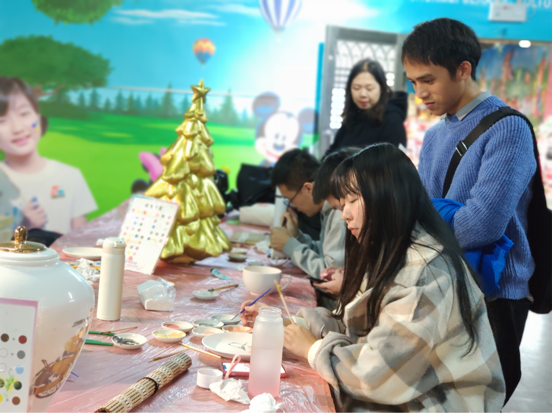 图为同学们在瓷盘、瓷碗上进行书画创作