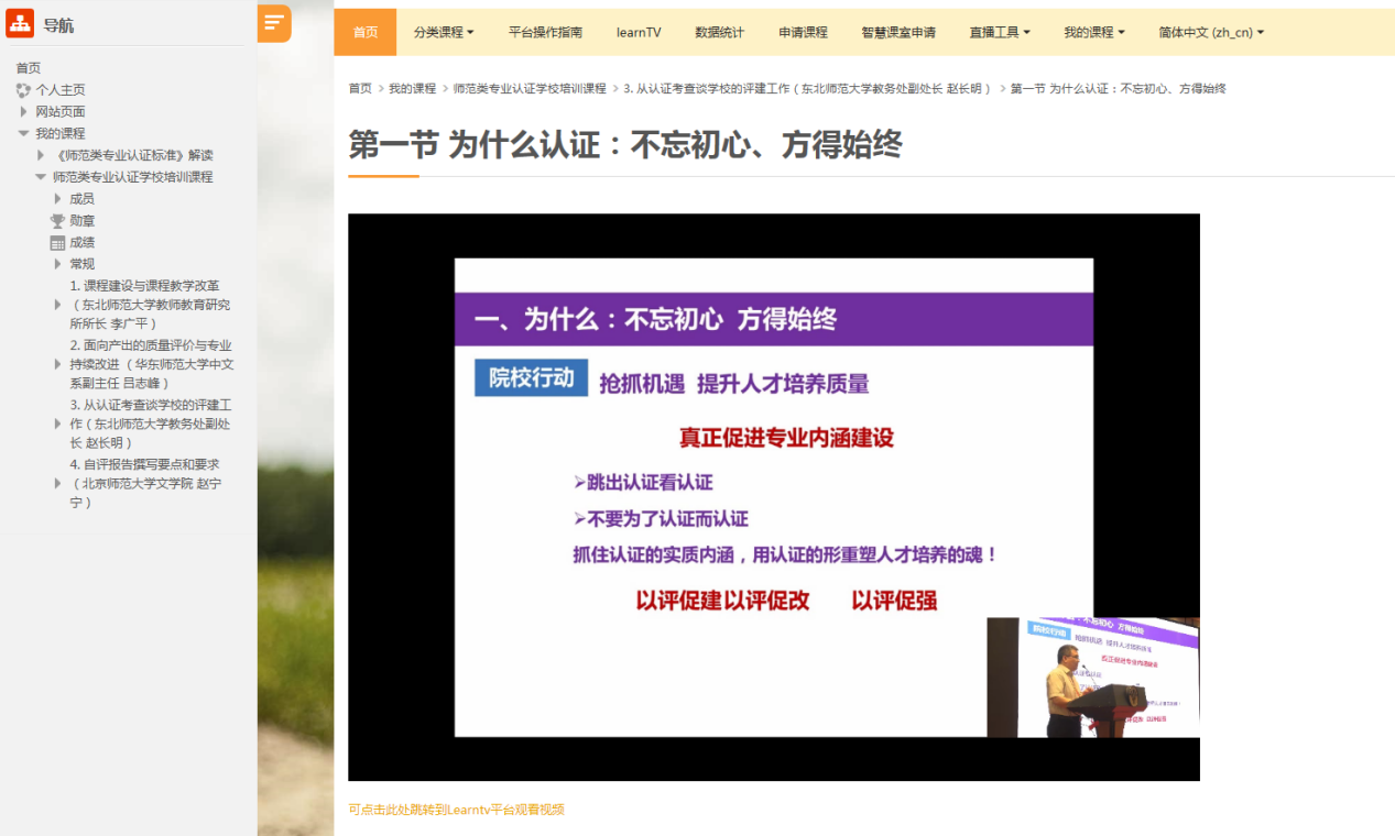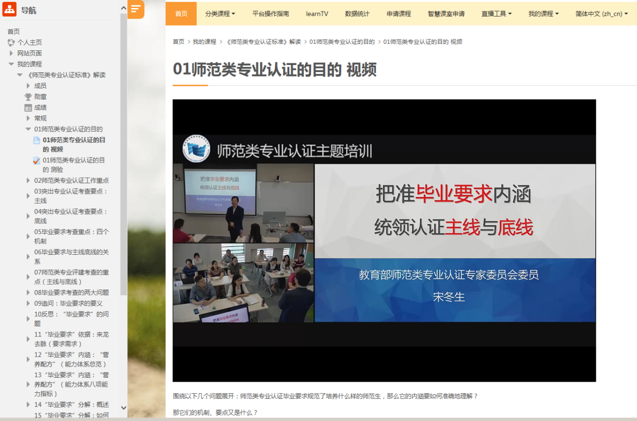 根据普通高等学校师范类认证专家委员会关于疫情防控期间师范类认证工作的有关安排,本次线上培训内容主要包括:教育部师范类专业认证专家委员会委员宋冬生关于《师范类专业认证标准》的解读;东北师范大学教师教育研究所所长李广平、华东师范大学中文副主任吕志峰针对师范类认证毕业要求内涵、课程体系构建、产出评价改进机制等所作的专题讲解;东北师范大学教务处副处长赵长明、北京师范大学文学院张宁宁就认证评建及自评报告撰写所进行的经验分享。