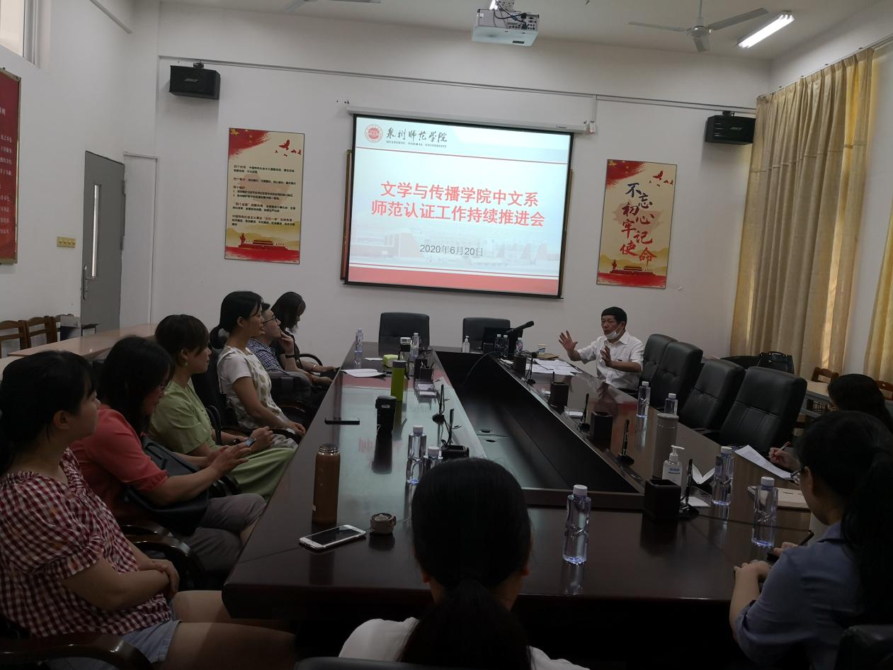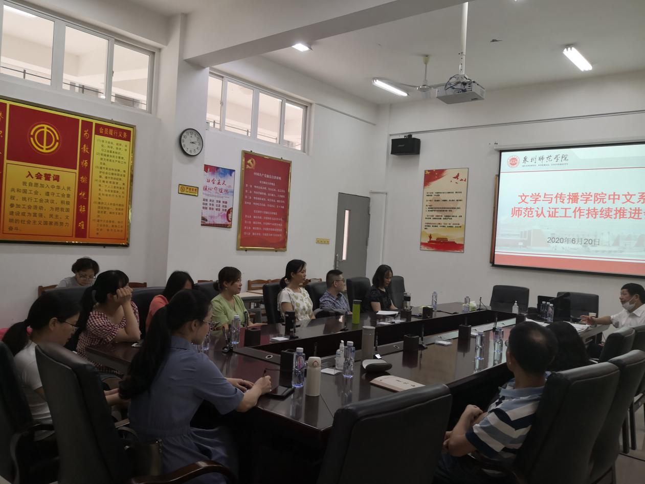 为进一步推进汉语言文学专业师范认证工作,2019年6月20日下午,文学与传播学院中文系召开师范类认证持续推进会。会议由李莉老师主持。文传学院副院长杨秋生、学院各职能部门、中文系全体教师参加会议。