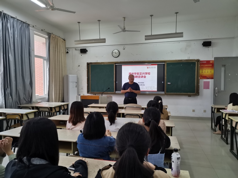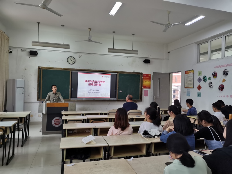 4月27日下午三点半,漳州华安正兴学校于文学与传播学院俊秀302教室召开招聘宣讲会。本次宣讲会由历史专业辅导员白荣耀老师主持,漳州华安正兴学校陈文玄校长主讲,我院17级历史专业和17级汉语言文学专业部分同学参加。