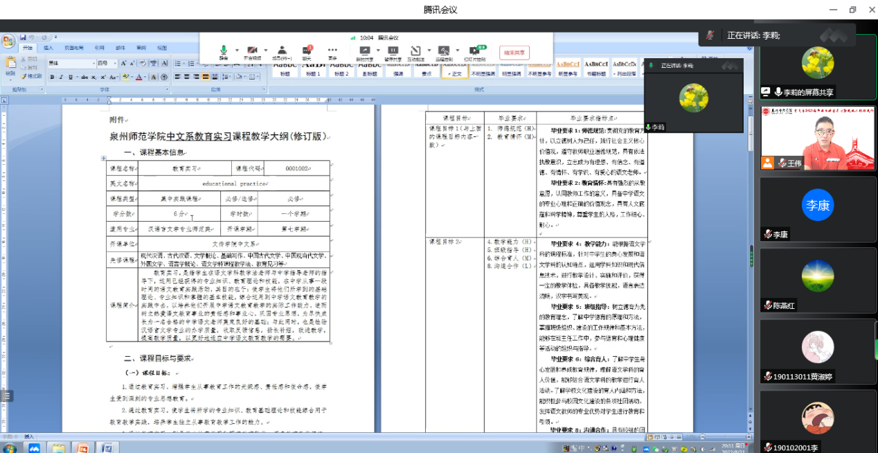 为了落实师范专业认证的指标要求,推动汉语言文学省级一流本科专业建设,支撑教育硕士专业学位授权点(培育)的创建工作,文传学院中文系于8月21日通过腾讯会议系统,线上举办“汉语言文学专业2023届毕业生教育实习暨就业工作推进会”,传达文件精神,强调注意事项,部署具体工作。会议由中文系主任王伟主持,分管实习实训工作的副主任李莉,学工办主任陈燕红,学科教学语文团队骨干教师曹茂才、陈琼莲、张丹丹,汉语言文学专业2019级全体同学参加本次会议。