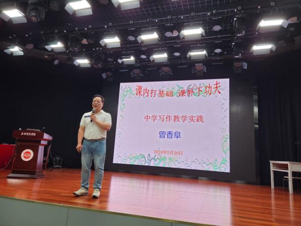 曾香阜老师则在《中学写作教学实践》的演讲中结合自身从教经历从“师容、师德、师才”三要素入手,而将写作教学阐释为一项“明师工程”。其认为:“明智”之师是初级阶段,主讲教师要注重教法学法,挖掘授课对象的写作潜能;“明理”之师是中级阶段,应围绕“文理、事理、情理”三个维度做到“文道统一”、以“文”服众;“明”之师是高级阶段需涵养学生创作“情怀”,进而提升作文“格局”。