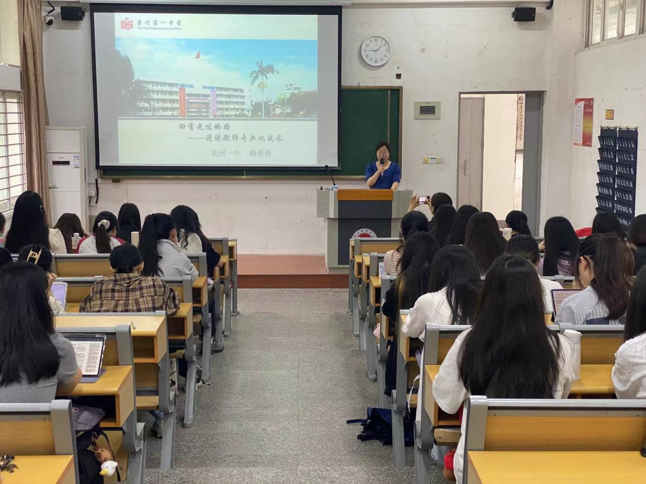 为了完善“大语文”育才格局,对表落实“申硕认证一体推进,铸就拔尖创新人才”总体战略构想,充分发挥福建省高校课程思政优秀教学案例“凝练闽南意象,讲好海丝故事”示范引领作用,文传学院中文系按照上级整体部署,邀请泉州一中高级教师赖蓉蓉于近日在俊秀文学院东楼109教室,为在学研究生(含联合培养)、汉语言文学高年级本科生,做了一场题为《回首走过的路——漫谈教师专业化成长》的精彩报告,并参与“专业培养目标、毕业要求与课程体系合理性评价”研讨活动。