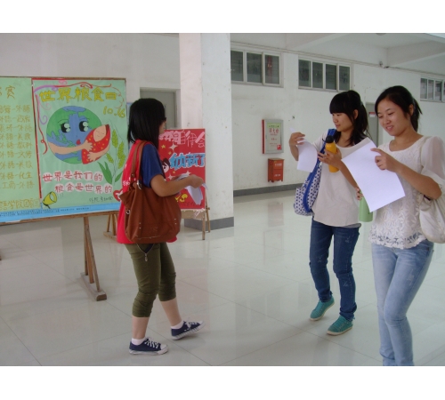 本次活动主要面向我院和文学与传播学院的学生。志愿者们在活动前准备好了宣传海报,印制了宣传单,在我院和文传学院各设置了一个宣传小组。活动中,志愿者们一边发放传单,一边向同学们介绍“世界粮食日”,并倡议大家加入“茶缸网”写微博,通过发一条相关微博这样的举手之劳,为还在挨饿的贫困孩子捐献一粒米。当同学们离开时,志愿者们不忘微笑提醒同学们,要从身边小事做起,在吃饭的时候注意不要浪费粮食。