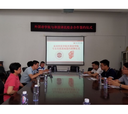 2017年10月12日上午,外国语学院与译国译民翻译服务有限公司校企合作协议签订暨授牌仪式在外文楼113会议室举行。学院党委书记李丽雪、副院长谢传生、副院长黄莉娜及相关教师,译国译民董事长林世宋等一行参加了签约授牌仪式。双方就翻译工作室的建立和运行、学生实习与就业、教师相关课题开展等合作事宜进行了深入交谈。谢传生副院长与林世宋董事长签署了校企合作协议书。当天下午,译国译民英语中心总经理谢亮亮还在112多媒体教室为我院学生进行了“职业翻译与翻译职业”的专题讲座。