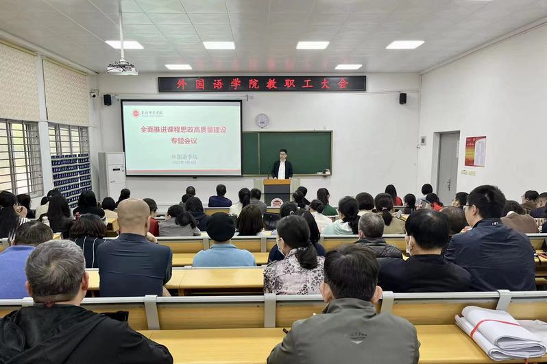 2023年4月6日下午,外国语学院在俊秀外文楼112召开了全面推进课程思政高质量建设专题会议。会议由教学副院长主持,全体教职员工参加。