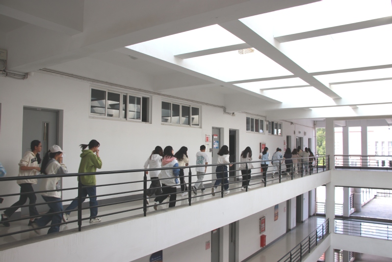 4月27日下午三点,消防安全应急演练活动正式拉开帷幕。60名学生先集中在俊秀外文楼502实验室观看学习消防安全和火场自救的宣传片,了解了在突发火情时应该如何正确应对,有序撤离。随后,60名学生分散到四间实验室,等待演习开始。三点二十分,模拟烟雾被点燃,消防警报随即拉响。同学们听到警报后迅速反应,从各自教室前后门快速撤离,并在此过程中注意做到遮挡口鼻,弯腰前行,最后就近从两侧楼梯疏散到院前广场。