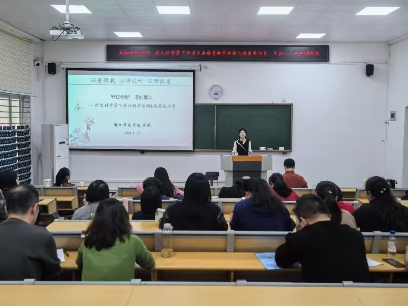 2024年11月21日,周口师范学院外国语学院罗瑞副教授应邀来我院开设“新文科背景下外语专业教育教学创新与成果奖培育”的专题讲座。讲座在外文楼112教室举行,黄诗海副院长及陈伟红主任共同主持,学院全体教师参与听讲。