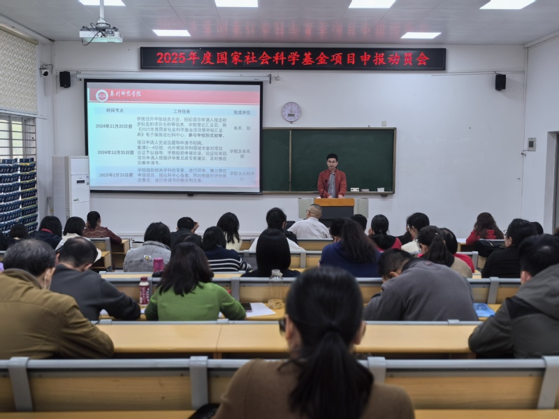 为做好2025年国家社会科学基金项目申报工作,提高项目申报质量,进一步提高学院的科研水平和学术影响力。近日,外国语学院在外112教室召开了“2025年国家社会科学基金项目申报动员会”,会议由学院副院长主持,全院教师参加。