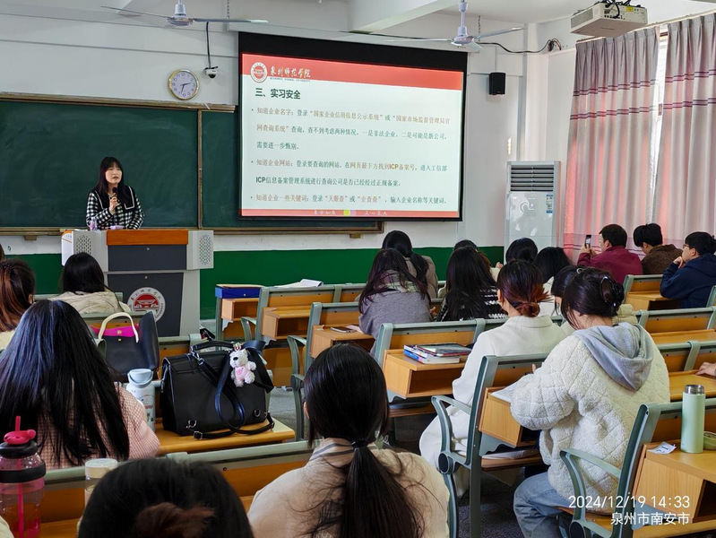 陈彩蓉老师着重就毕业实习安全问题进行了深入讲解。她指导学生如何通过多种渠道查询实习企业信息,确保实习单位的合法性和正规性,如利用“国家企业信用信息公示系统”“国家市场监督管理局官网查询系统”“天眼查”“企查查”等平台进行全面了解。陈老师还结合实际案例,提醒同学们在实习期间要时刻保持安全意识,遇到问题及时与学校和相关部门取得联系,保障自身安全。