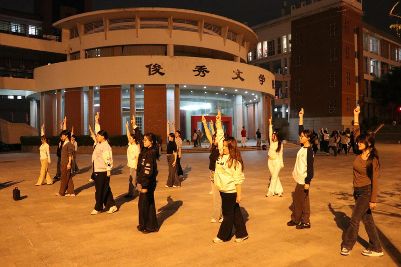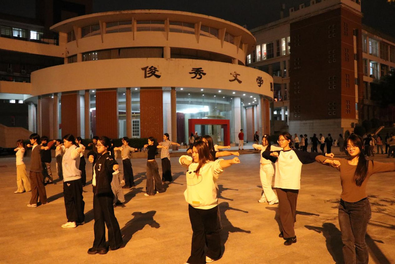为迎接我校第43届运动会,外国语学院组织2025级新生开展排舞训练。