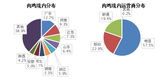 BlackMoon僵尸网络位于境内肉鸡按省份统计,排名前三位的分别为广东省(12.7%)、河南省(9.3%)和江苏省(7.6%);按运营商统计,电信占57.5%,联通占22.9%,移动占19.4%。