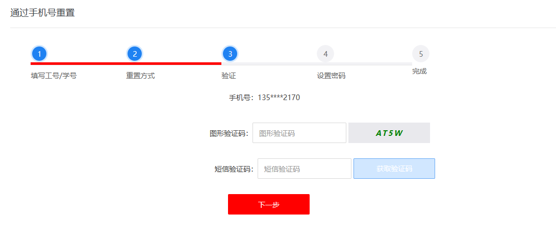 3. 核对手机号(如手机号有误,请参考下面第二点),输入图形验证码,点击获取验证码,输入短信验证码,点击下一步。