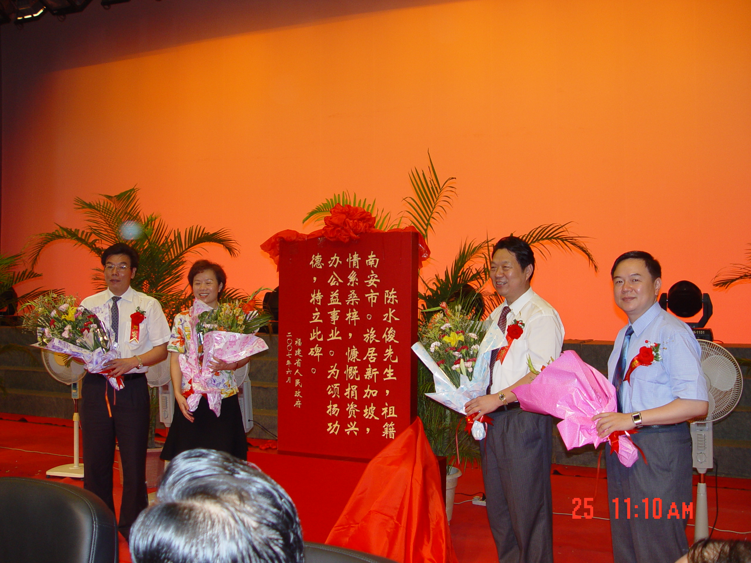 表彰会上,曾晓民主任宣读了“福建省人民政府侨务办公室关于以福建省人民政府名义对陈水俊先生捐资兴办公益事业立碑表彰的决定”并为陈先生颁发“福建省捐赠公益事业突出贡献奖”金质奖章、奖匾及荣誉证书。市政府秘书长李冀平先生宣读泉州市人民政府“关于对陈水俊先生捐资兴办公益事业给予立碑表彰的决定”; 市长朱明先生为陈先生颁发了“泉州市捐赠公益事业特别突出贡献奖”奖匾及荣誉证书。