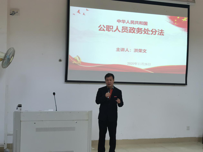 2020年11月26日下午,我院党委副书记、纪委书记洪荣文在理工218教室为全体教职工和学生党员代表开展以《中华人民共和国公职人员政务处分法》宣讲为内容的党课。