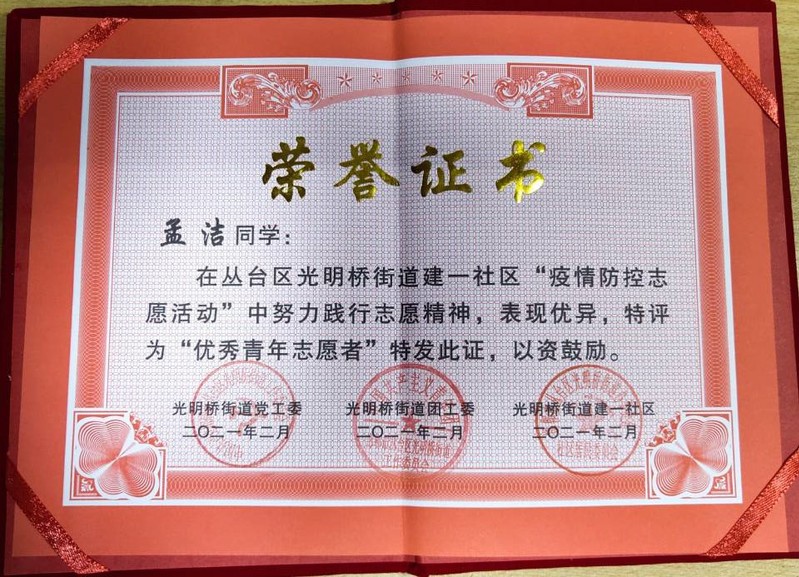 “看到社区发布的招募消息,想到能够帮助同在外省学习和生活的同胞们,就想着能为大家出一份力。”孟洁同学说道。孟洁同学作为入党积极分子,能在疫情防控期间勇于担当、甘于奉献,体现了一名新时代入党积极分子应有的责任感和使命感。地方党委、政府给予的表扬不仅是对孟洁同学参与疫情防控工作的鼓励,也是对我院落实立德树人任务、提升“三全育人”工作的肯定。