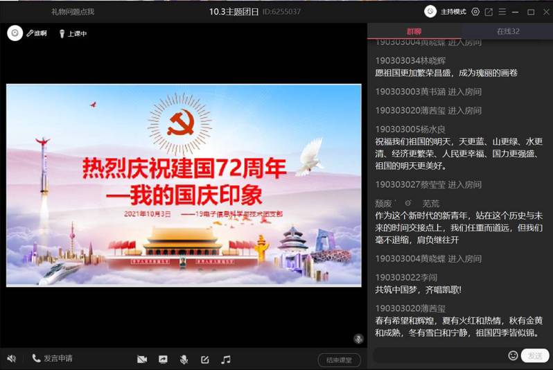 同学们围绕“请党放心 强国有我”主题,集体观看纪录电影《1950他们正年轻》片段,结合所学历史知识,纷纷抒发自身的感受和体会。各宿舍围绕文明宿舍创建活动要求,积极行动起来,整理卫生,收拾床铺,养成良好的行为习惯,以高度的思想自觉和行动自觉投入文明宿舍创建活动中。院团委组织各团支部开展“我的国庆印象”线上主题分享会,同学们积极连线,畅所欲言,表达自己对伟大祖国浓厚的情感。