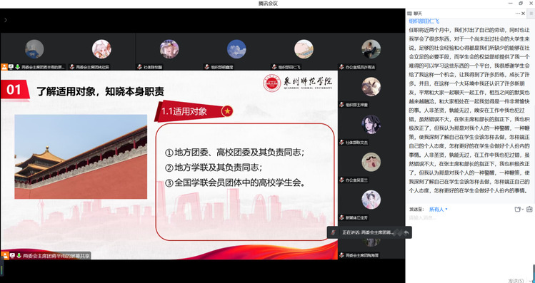 为深入学习宣传贯彻党的二十大精神,提高学院学生会工作人员思想政治素质与工作能力水平,我院于2023年1月18日下午在线上举办2022-2023学年第一学期学生会工作人员培训班。此次培训由学院学生会主席团成员宣讲,全体学生会工作人员参加。