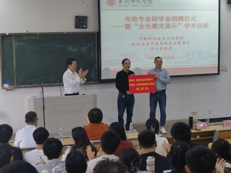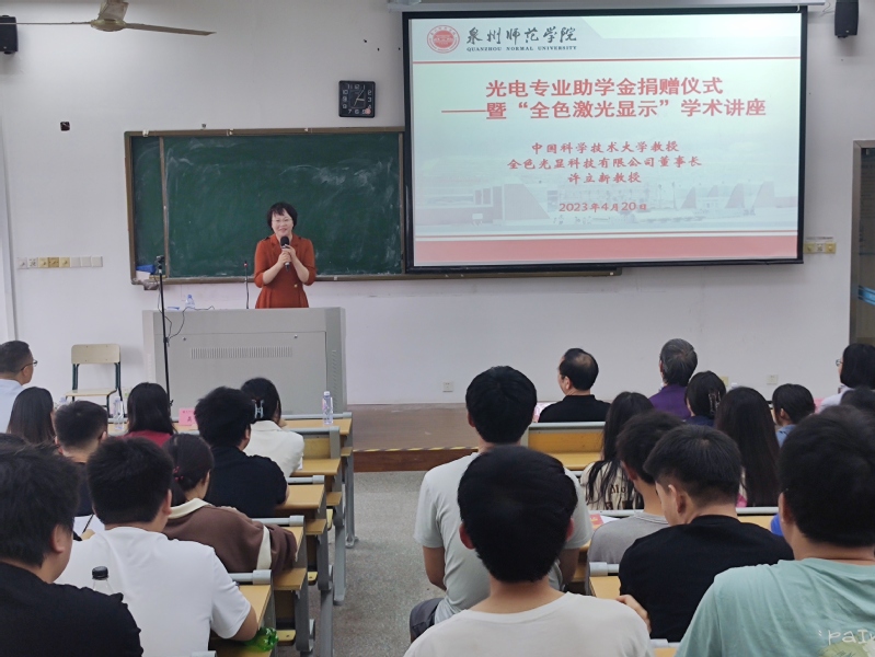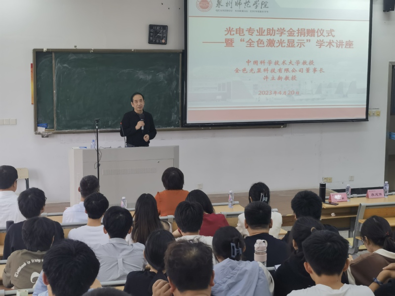 4月20日下午,我院在千墅楼516教室举行光电专业助学金捐赠仪式暨“全色激光显示”学术讲座。中国科学技术大学教授、全色光显科技有限公司董事长许立新,我院党委书记吴丽双、院党委副书记兼纪委书记洪荣文、副院长陈木生、福建省先进微纳光子重点实验室主任廖廷俤、院办公室主任骆如林、光电专业主任段亚凡、辅导员、光电专业教师和全体学生参加,活动由洪荣文主持。