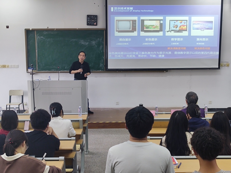 捐赠仪式伊始,段亚凡上台代表光电专业接受许立新捐赠的光电专业助学金2万元,用于光电专业助学金。随后,吴丽双代表学院致辞,对慷慨解囊捐资的许立新教授表示感谢,衷心祝愿他在事业上蒸蒸日上,也希望同学们常怀感恩之心,以优异的成绩回报社会。接着,许立新教授致辞,希望学生能刻苦钻研,勤学苦练,学好专业知识本领,勇攀科学高峰。捐赠仪式结束后,许立新为光电专业师生举行学术讲座,讲座内容包括全色激光显示原理、整机设计理论及相关的关键科学技术问题等。