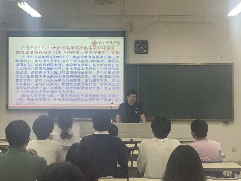 柯世池围绕学习贯彻习近平新时代中国特色社会主义思想,讲述了学习贯彻党的创新理论的收获和感悟,阐释了运用习近平新时代中国特色社会主义思想的立场观点方法改进工作、推动发展的举措方法,教育引导广大学生真学、真懂、真信、真用,坚定跟党走的信心和决心。李国栋围绕学习贯彻习近平总书记在中共中央政治局第五次集体学习时的重要讲话精神,讲述了习近平总书记关于教育的重要论述,阐述了教育在党和国家事业全局中的重要地位和作用,教育引导学生以这一重要讲话为思想引领,不断开拓进取,为推进强国建设、民族复兴贡献智慧和力量。黄祖榜结合“形势与政策”教学,深入学习贯彻习近平总书记关于做好新时代人才工作的重要思想,阐释了人才作为第一资源对我国经济社会建设的重要意义,讲明了聚天下英才而用之的政策措施,引导广大学生深怀爱国之心、砥砺报国之志,成为国家所需的栋梁之材,肩负起时代赋予的使命责任。潘雅婷围绕“以奋斗姿态激扬青春”主题,向同学们分享了习近平总书记对新时代中国青年的期望,做有理想、敢担当、能吃苦、肯奋斗的新时代好青年,让同学们更加坚定理想信念,用奋斗照亮青春之路,扛起时代赋予的使命,在新时代奋进有为,勇于担当。