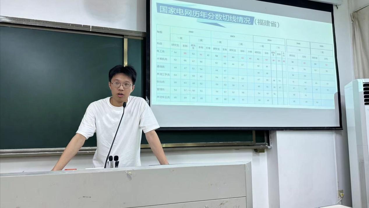 随后,成功考取泉州电网的陈劲松同学结合自身备考经历深度解析国网招聘全流程。他着重强调专业课学习的核心地位,建议同学们利用课余时间反复刷题补强薄弱环节,并鼓励大家保持稳定备考节奏,以扎实学识筑牢根基。考取南平电网的杨承禹同学针对常见问题进行补充解答,特别提醒备考过程中需保持积极心态,以坚韧毅力应对挑战。