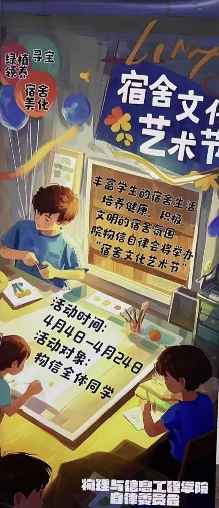 为深化“一站式”学生社区建设,让寝室成为思想教育的阵地、文化交流的窗口、行为养成的课堂,为丰富学生课余生活,营造温馨和谐的宿舍文化氛围,物理与信息工程学院于4月3日至6月11日举办宿舍文化节系列活动。此次宿舍文化节以“寓见美好,宿说青春”为主题,从寝室环境打造到文化内涵挖掘,从个人风采展示到集体凝聚力凝聚,激活寝室育人的无限可能,让每个小“家”,都成为成长的大舞台。