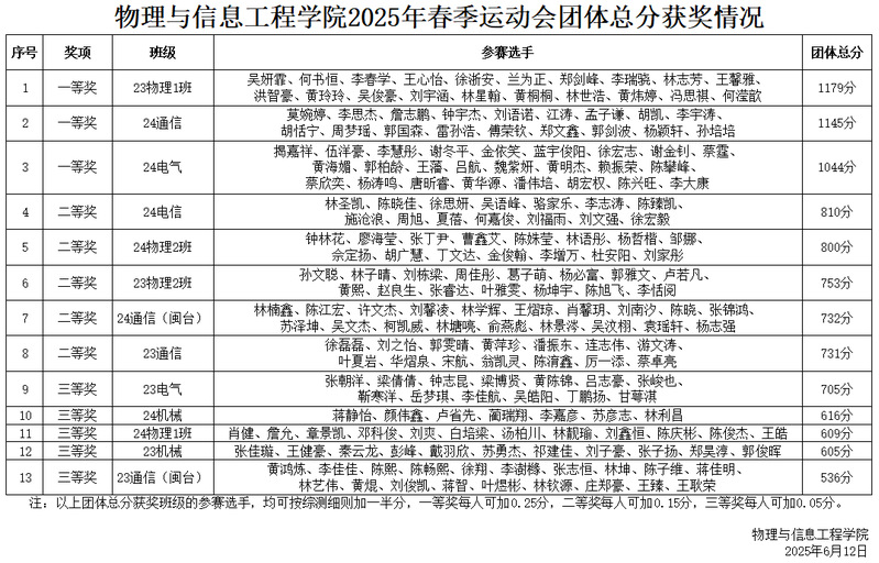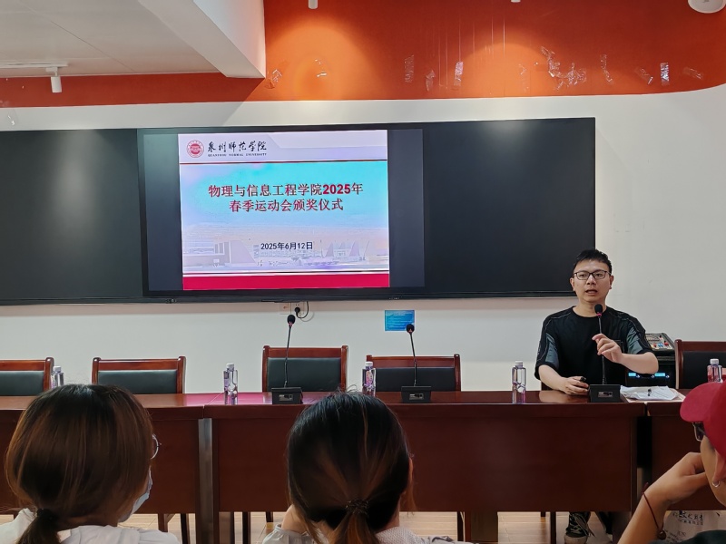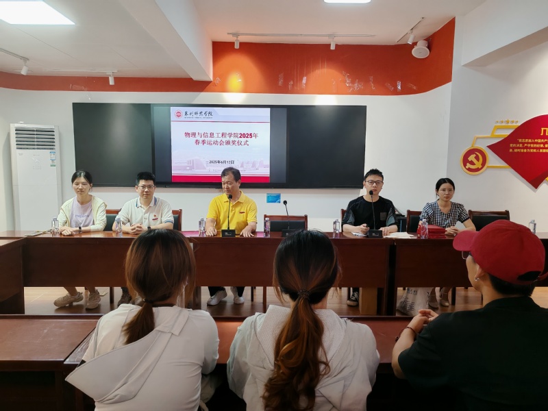颁奖仪式现场气氛热烈,大屏幕上播放着运动会期间的精彩瞬间。辅导员黄祖榜表示,此次学院春季运动会不仅是一场体育竞技,更是展现物信学子青春风采、凝聚集体力量的重要平台。运动员们在赛场上展现出的顽强拼搏、团结协作精神,正是学院一直倡导的体育精神与奋斗精神的生动体现,希望学生们能将这种精神延续到日常学习与生活中,在各个领域绽放光彩。