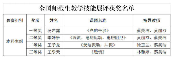 我校首次组织师生参加此项赛事,赛前一个月,物理信息与工程学院精心组建了由吴丽双、蔡美洁、徐玉兰、林雅婷4位经验丰富的教师组成的指导团队,采用线上线下相结合的方式,为参赛学生提供全方位、个性化的辅导,通过多轮模拟演练和细致点评,学生的教学技能得到显著提升。比赛期间,4名学子在全国赛场上沉着应战、精彩展示,斩获佳绩,充分展现了我校物理师范教育的优良成果。