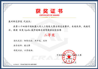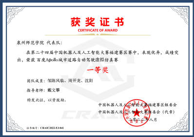 819日,第二十四届中国机器人及人工智能大赛全国总决赛成功落下帷幕经过校赛、省赛、国赛层层选拔,我校交通与航海学院汽车服务工程专业学子首次组队参赛旗开得胜,荣获百度Apollo城市道路自动驾驶虚拟仿真赛全国总决赛二等奖(团队成员:邹陈风临、周开龙、沈阳,指导老师:戴文攀),这也是福建省高校此次赛项取得好成绩