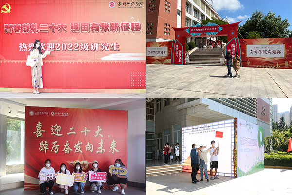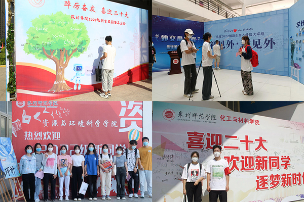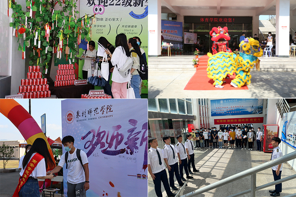 “梦想从泉师启航”“星汉灿烂迎新季,幸甚至哉遇见你。”“你来了,就是校园最美的风景。”“世界那么大,泉师幸有你”……校园内各具特色标语吸引新生“打卡”留念,各类“花式迎新”让远道而来的学子感受到家一般的温暖。文学与传播学院学生们身着中国传统服饰,调素琴、做书画、吟古诗、品清茶,为迎新工作增添古香古色的文化氛围;海洋与食品学院师生将对萌新们的满满心意寄予亲手制作的蛋挞,酸奶,小饼干中,让萌新们吃在嘴里,暖在心间;纺织与服装学院为每一位新生订制一枚“院徽”纽扣作为入学迎新礼,希望新生“扣好人生第一粒扣子”,立足新起点,奋斗新征程;教育科学学院学生党员在卡通人物“青芒”的号召与集结下,组建“学生党员先锋岗”,为新生传授防疫知识,带动新生积极参加疫情防控志愿服务;美术与设计学院为新生订制专属可乐和“盲盒”,寓意新生们在大学求学路上都能学好专业技能、练好自己专属看家本领,在人生新阶段主动追寻未知的美好;体育学院龙狮队用喜庆热闹的舞龙舞狮表演为新生们接风洗尘,表达对新生们的热烈欢迎与美好祝愿。