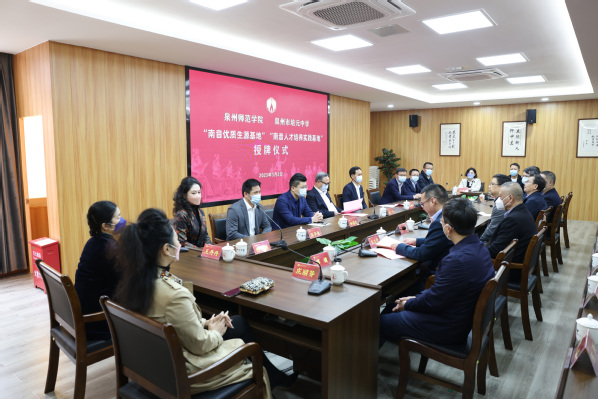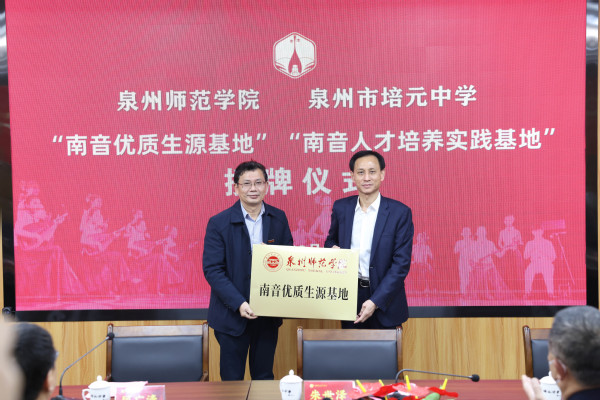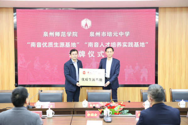3月2日上午,英国威廉希尔公司官网“南音优质生源基地”“南音人才培养实践基地”“优质生源基地”授牌仪式在泉州市培元中学举行。福建省人大常委会委员、省人大社会建设委副主任委员、校党委书记朱世泽,校长屈广清,培元中学党委书记郭国金、校长谢顺元,泉州市南音传承中心主任庄丽芬,培元中学南音校园传承顾问王大浩,以及我校相关职能部门和二级学院负责人、培元中学领导和部门负责人等参加。