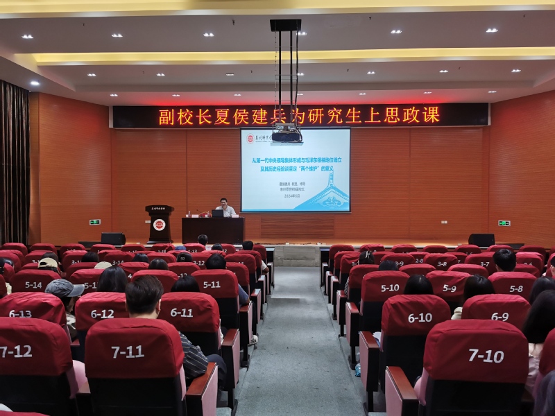 6月5日下午,副校长夏侯建兵在特教大楼第二学术报告厅为研究生讲授《从第一代中央领导集体形成与毛泽东领袖地位确立及其历史经验谈坚定“两个维护”的意义》专题思想政治课。我校各研究生培养单位研究生代表参加学习。
