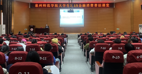 在3.15国际消费者权益日来临之际,为增强大学生金融风险防范意识,3月13日下午,我校在特教大楼第二学术报告厅举办大学生3.15金融消费普法课堂宣讲会。本次活动邀请泉州市中级人民法院刘圣楠法官、丰泽区人民法院蔡洋洋法官莅临主讲,各二级学院(系)师生代表160余人参加。宣讲会由学生工作部黄志梅老师主持。