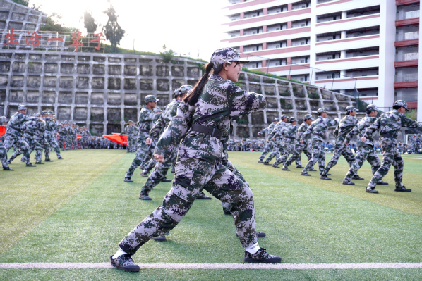 伴随雄壮的国歌声,军训会操拉开序幕。各方队依次列队,脚踢正步,有序入场;匕首操、旗语操、刺杀操、军体拳、舞旗、战术方阵等军事科目汇演依次展开,检验此次军训取得的良好成果,充分展示了学子们昂扬向上的精神风貌。