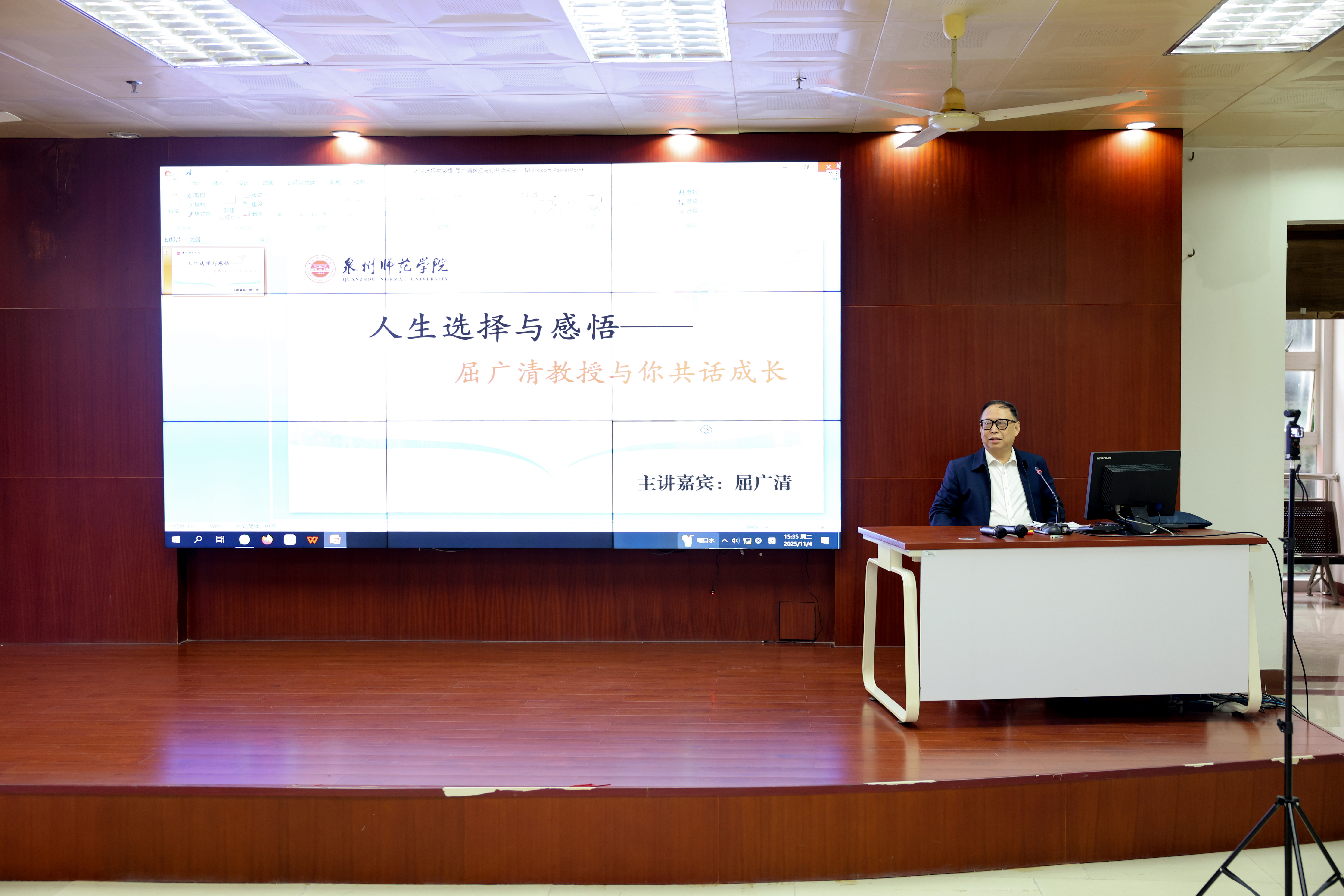主题讲座上,屈广清以“人生选择与感悟”为题开讲。他结合自身求学与就业经历,从青春、读书、选择、感悟四个维度展开分享,告诫青年学子在人生的每个十字路口要慎重抉择,一旦作出选择就不要后悔不要抱怨,更不要因遇到困境而躺平,而是要坚定地创造条件,实现梦想。他讲述了他的新书《弹弓少年》中关于儿时的农村回忆,叮嘱师生要珍惜生命、懂得感恩、不怕吃亏,他朴实却深刻的话语让现场师生受益匪浅。互动环节中,听众积极提问,交流氛围十分热烈。屈广清向现场提问的师生赠送了自己的新书。