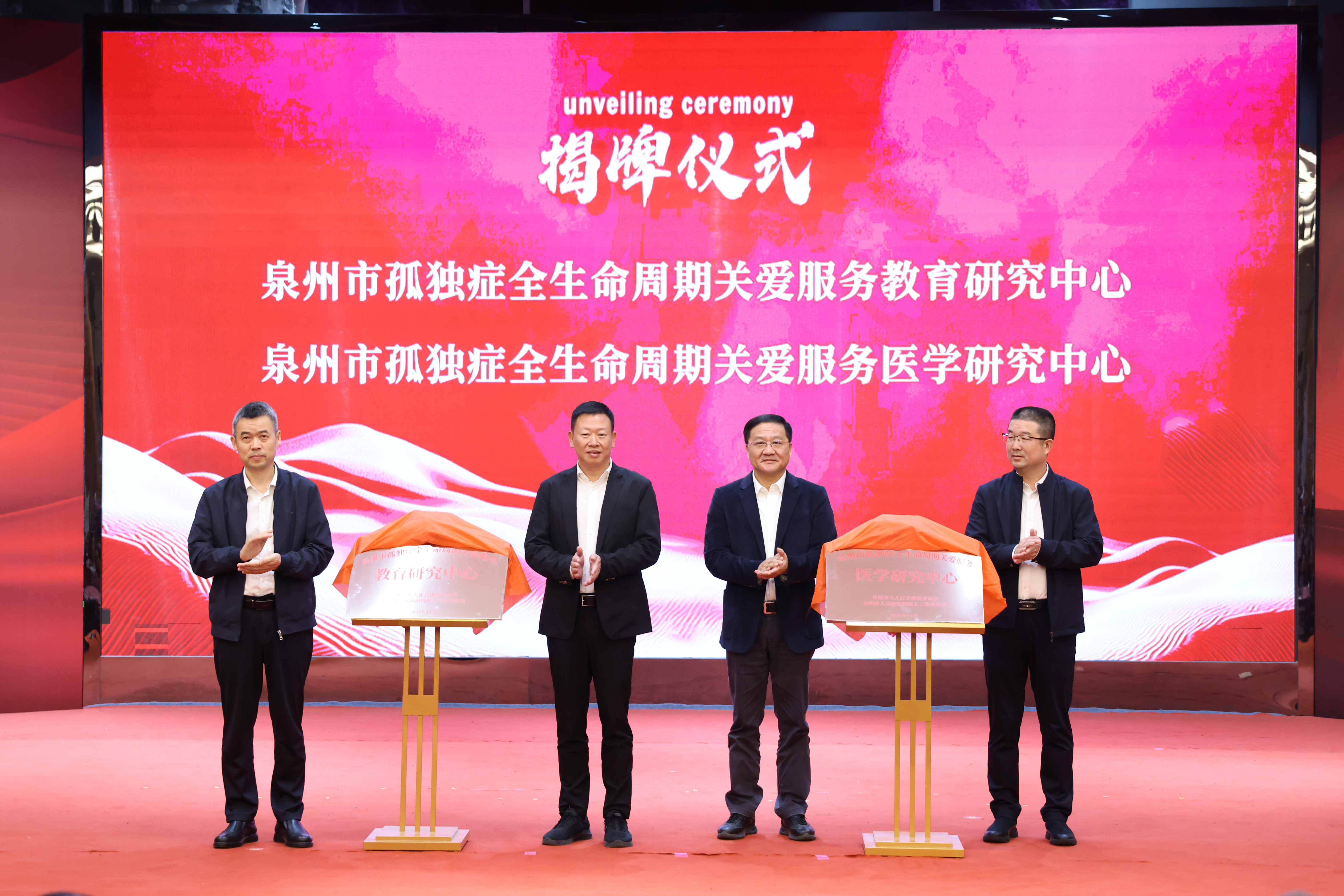 黄辉灿、陈昌萍、李伯群、连景忠共同为“泉州市孤独症全生命周期关爱服务教育研究中心”和“泉州市孤独症全生命周期关爱服务医学研究中心”揭牌。
