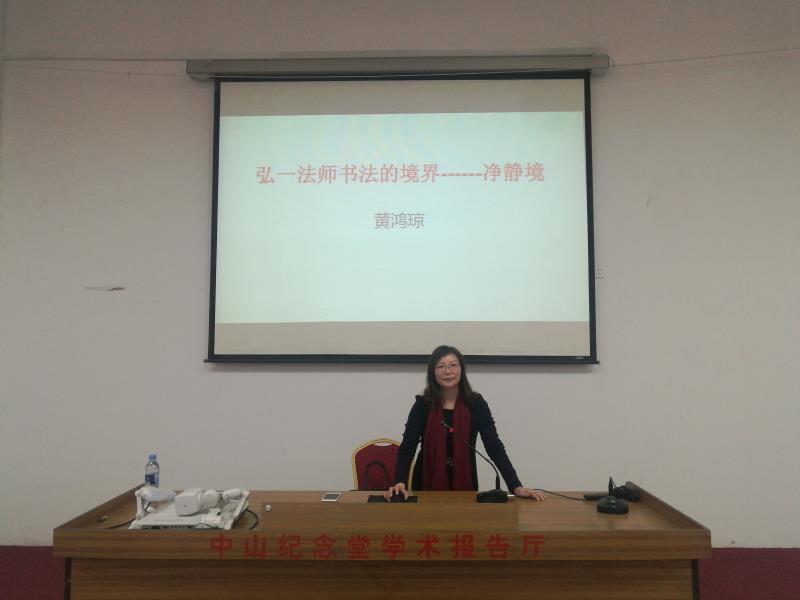 12月13日晚,中国书法家协会女子委员会副主任、我院书法研究生部主任黄鸿琼教授于中山第一学术报告厅开展了一场题为“弘一法师书法的境界——净静境”学术讲座。我院广告、广电、中文、书法专业近百名同学听取了讲座。